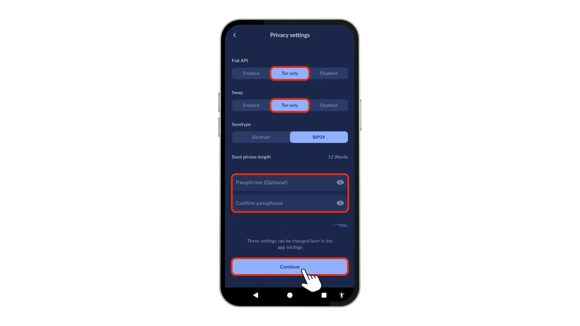 On the next screen you can choose from a wide range of cryptocurrencies. Select Bitcoin and tap on Next and provide a Wallet name to identify the wallet. By tapping on Advanced Settings a range of Privacy Settings appear. Make these changes: