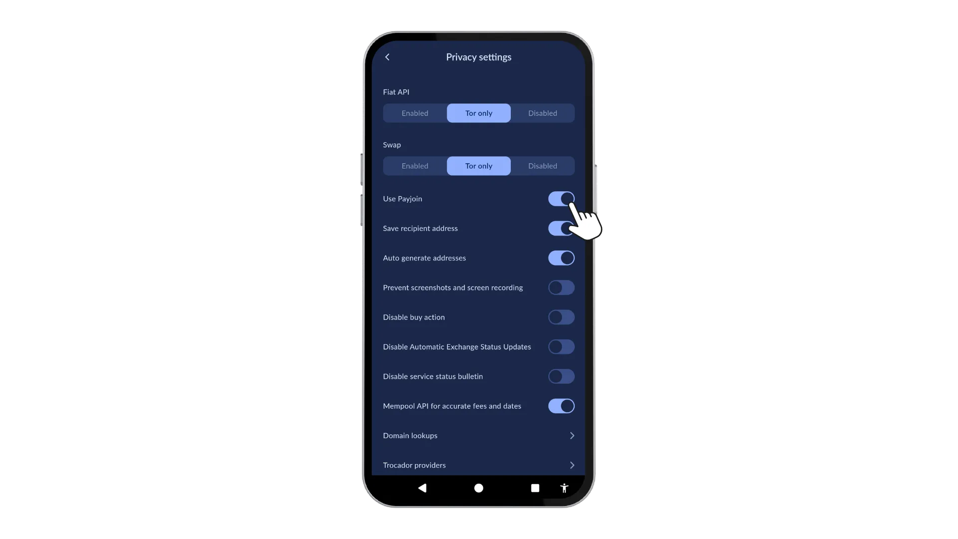 We can enhance our wallet’s security by using Tor to encrypt our internet connection and safeguard our privacy when accessing external sources. Additionally, we can prevent screenshots to keep our wallet information confidential, enable auto-generated addresses to create new ones for each transaction, and disable buy/sell actions to prevent unauthorized transactions. We can also enable PayJoin, which is another privacy feature we will review later.