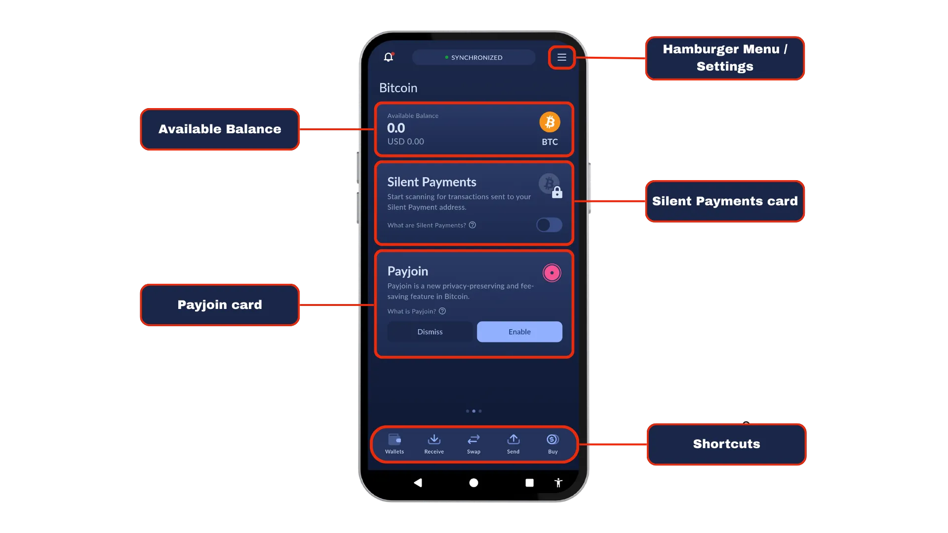 - Shortcuts at the bottom to Wallet Overview, Receive, Swap between Bitcoin and other currencies, Send, and Buy