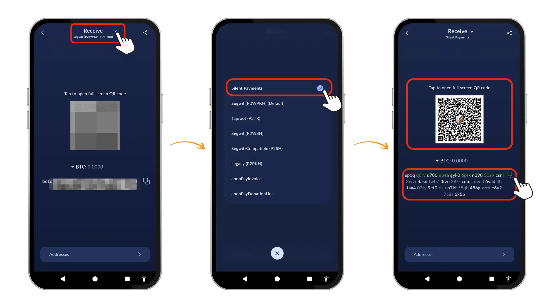 There are several options and address types available for receiving Bitcoin. Segwit (P2WPKH) (starting with bc1q….) is the default option. Let’s select Silent Payments in this example.