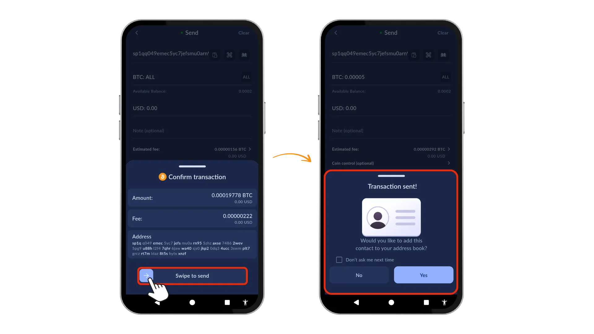 Once you have sent the transaction, you will be asked if you would like to add this contact to your address book.