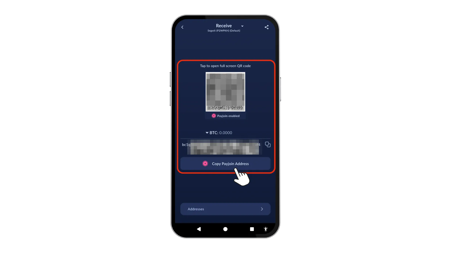 - Tap on Receive on the Home screen and you will be presented with a PayJoin QR code and copy button (when Segwit is selected)
