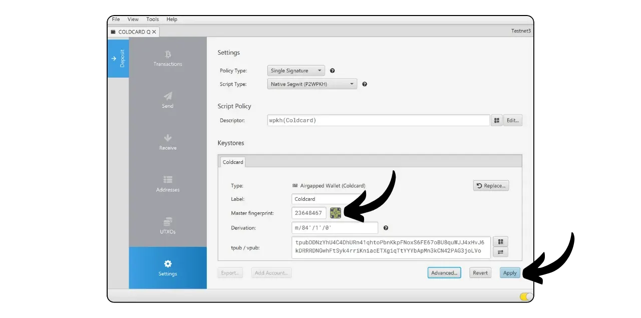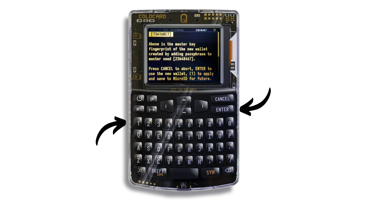 Once you’ve set your passphrase, COLDCARD Q will show you the master key fingerprint of the new wallet associated with this passphrase. Be sure to save this fingerprint. When you re-enter your passphrase when you use your device in the future, you’ll be able to check that the fingerprint displayed matches the one you saved. This check ensures that you haven’t made a mistake when entering your passphrase.