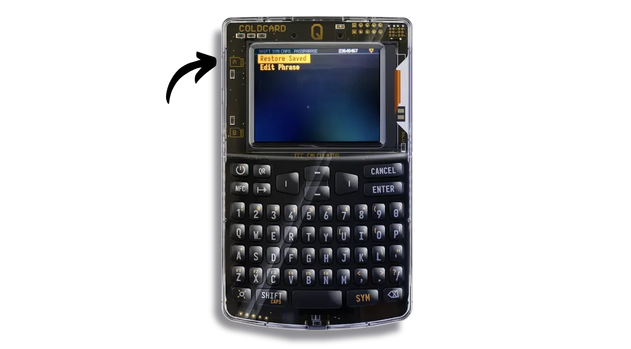 If you’ve saved the passphrase on a microSD card, each time you use it, insert it into the COLDCARD and access the “Passphrase” menu. Your COLDCARD will load the passphrase directly from the microSD, so you won’t need to enter it manually. Click on “Restore Saved”.