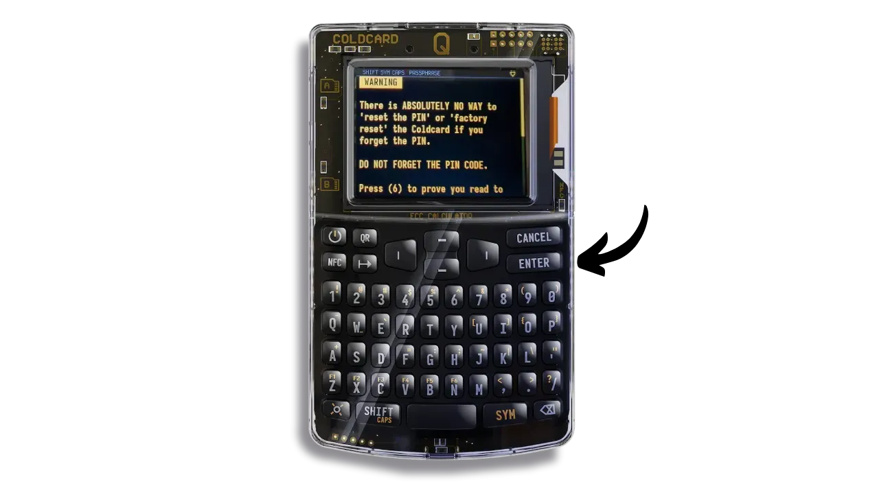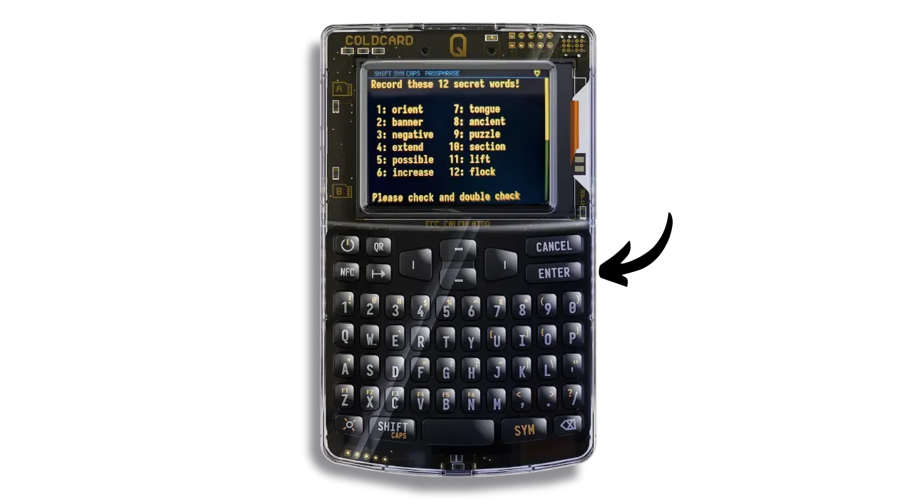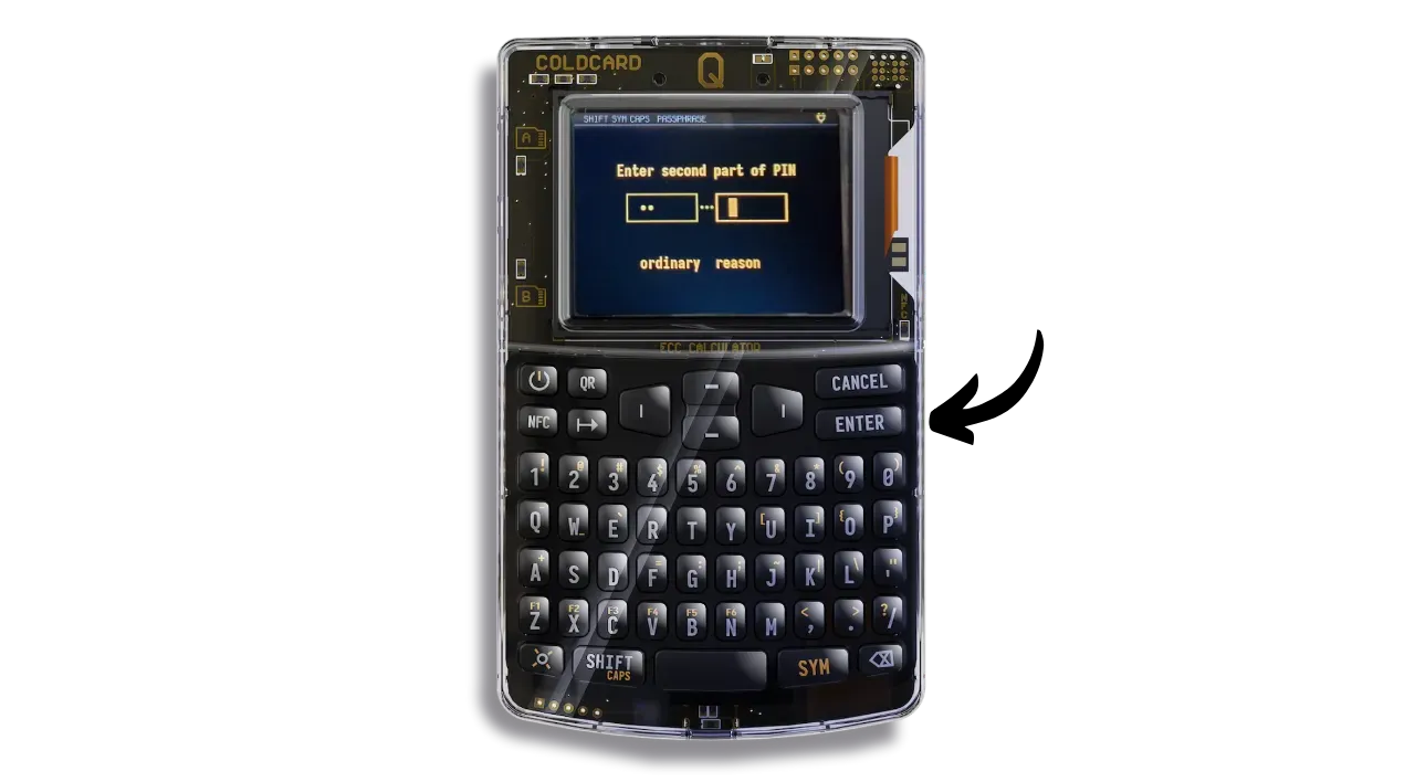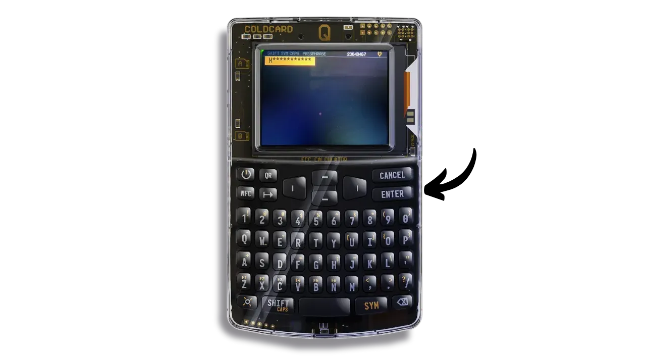 Bear in mind that once you’ve set up the passphrase on your wallet, your mnemonic alone won’t be enough to regain access to your bitcoins. You’ll need both the mnemonic and the passphrase. What’s more, you’ll need to enter the passphrase every time you unlock your COLDCARD Q. This enhances security by making physical access to the COLDCARD and knowledge of the PIN insufficient without the passphrase.