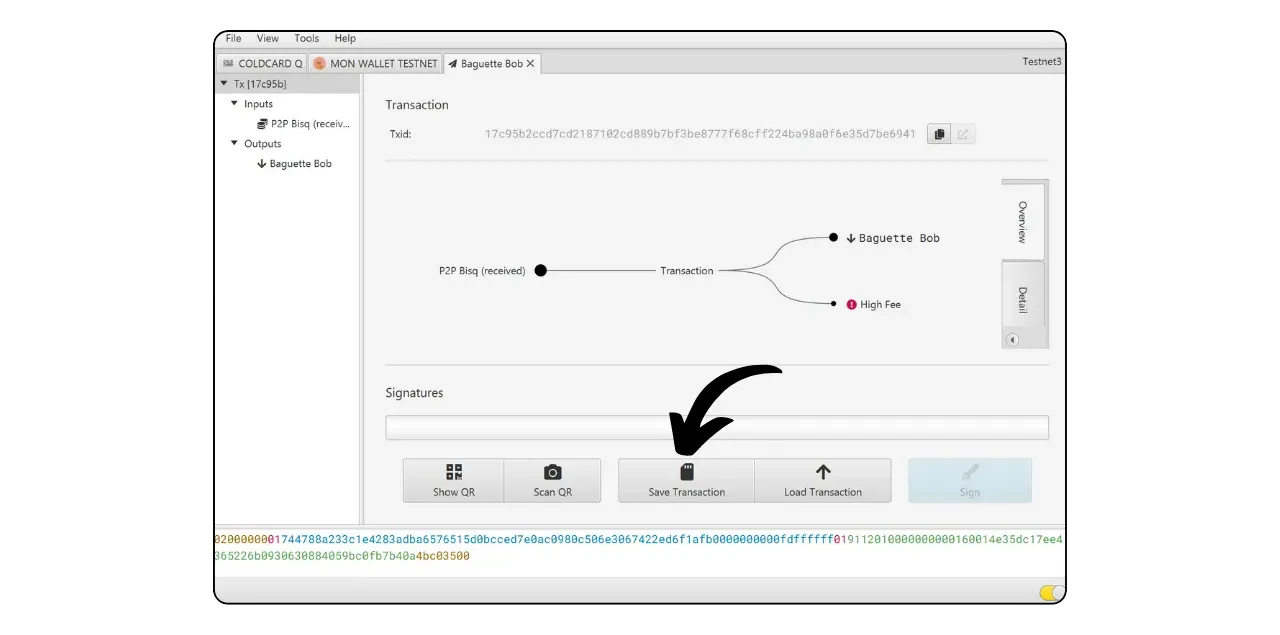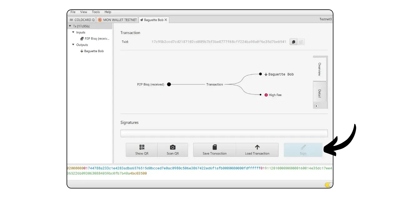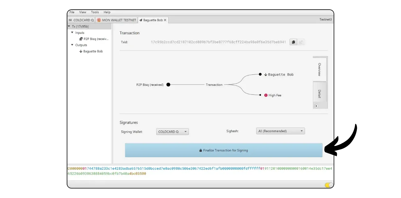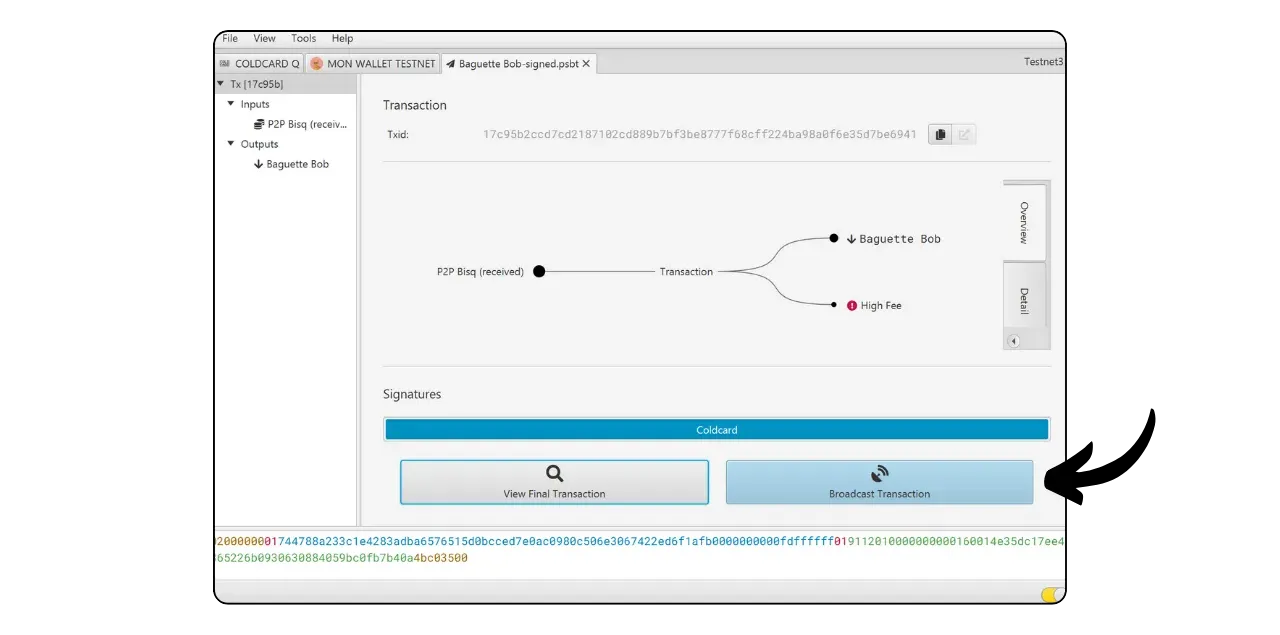Your signed transaction is now visible on Sparrow. Check one last time that everything is correct, then click on “Broadcast Transaction” to broadcast it on the Bitcoin network.