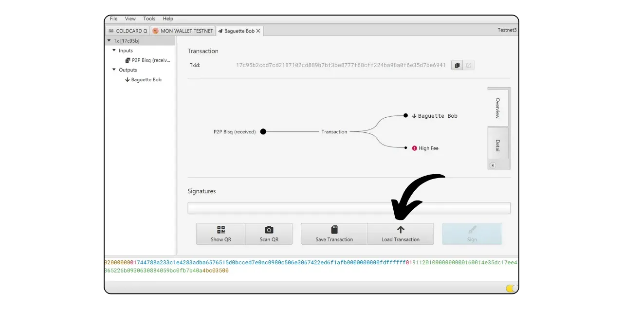 Then place the microSD back in your computer and on Sparrow, click on “Load Transaction” to load the signed transaction from the microSD. You’ll then be able to perform a final check before uploading it to the Bitcoin network.