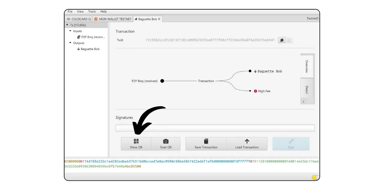 The second method of signing with your COLDCARD in Air-Gap, which is much simpler than the microSD method, is to scan the PSBT directly via the device’s camera. On Sparrow, select “Show QR”.