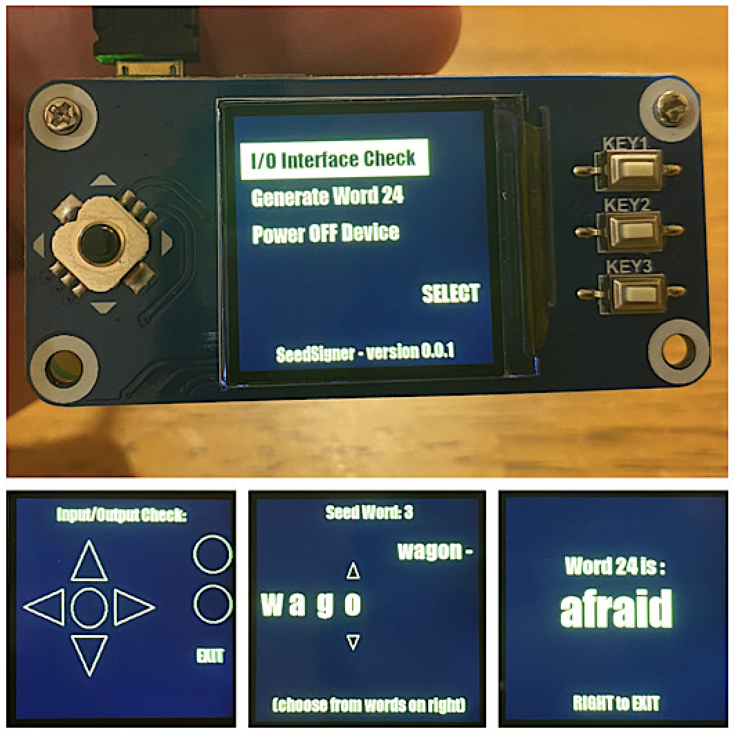 Builders purchasing their own components should be ensure the display + controls module they order has the 240x240 pixel designation, as Waveshare offers several display + control modules with similar hardware profiles, but that will not be compatible with the released SeedSigner software.