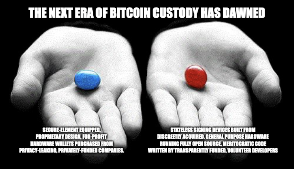 This “manifesto” then seeks to advance the idea that with the right mix of design inputs, users can have access to simple, user-friendly bitcoin self-custody, with solid security assurances, using inexpensive, discreetly-acquired hardware, & FOSS code.)