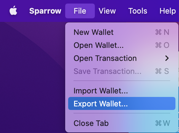SeedSigner is currently compatible with Specter’s wallet descriptor format. To export a wallet descriptor using that format in Sparrow, with your wallet loaded, navigate to File —> Export Wallet: