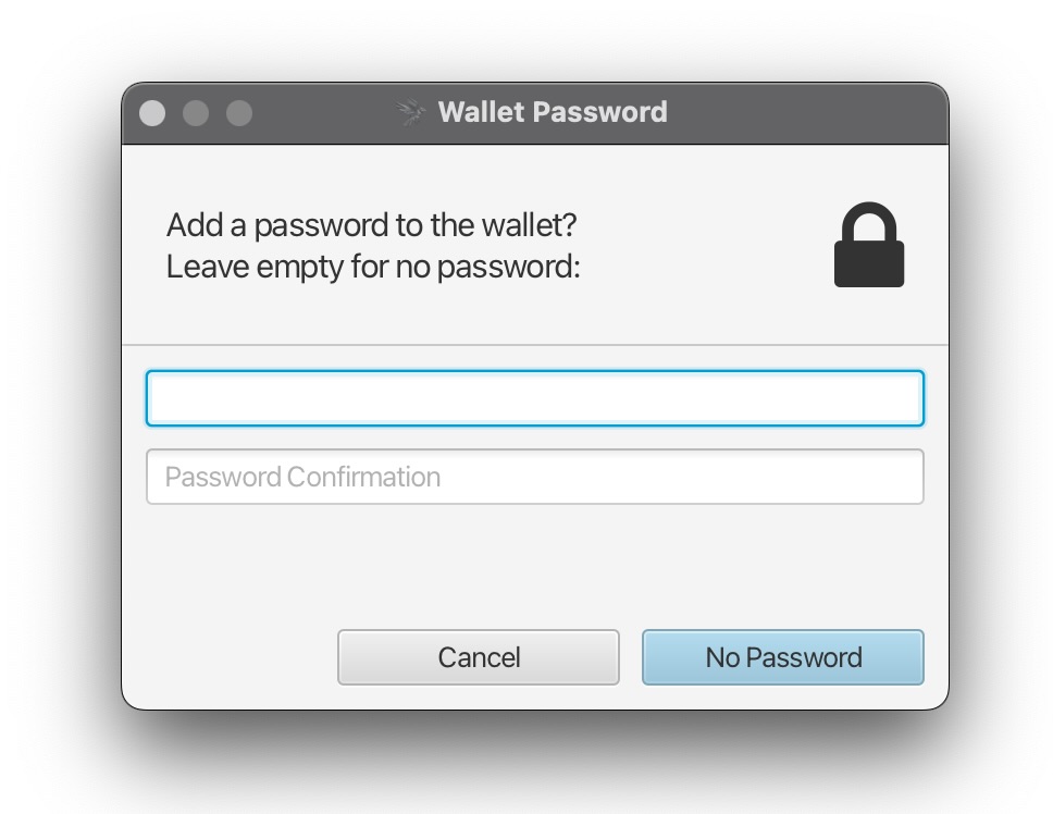 You may now click the “Apply” button in the lower right portion of the window to finalize the settings; Sparrow will display a final prompt asking if you would like to add a password to your wallet: