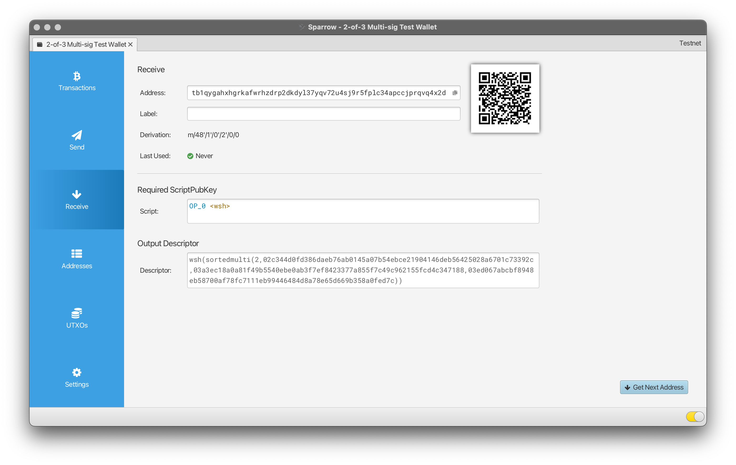 Now that you have created a multi-signature wallet and saved the wallet’s descriptor, you’re ready to receive some coins! To do so, you just need to visit the “Receive” section of the Sparrow wallet, along the left-hand side of the main window: