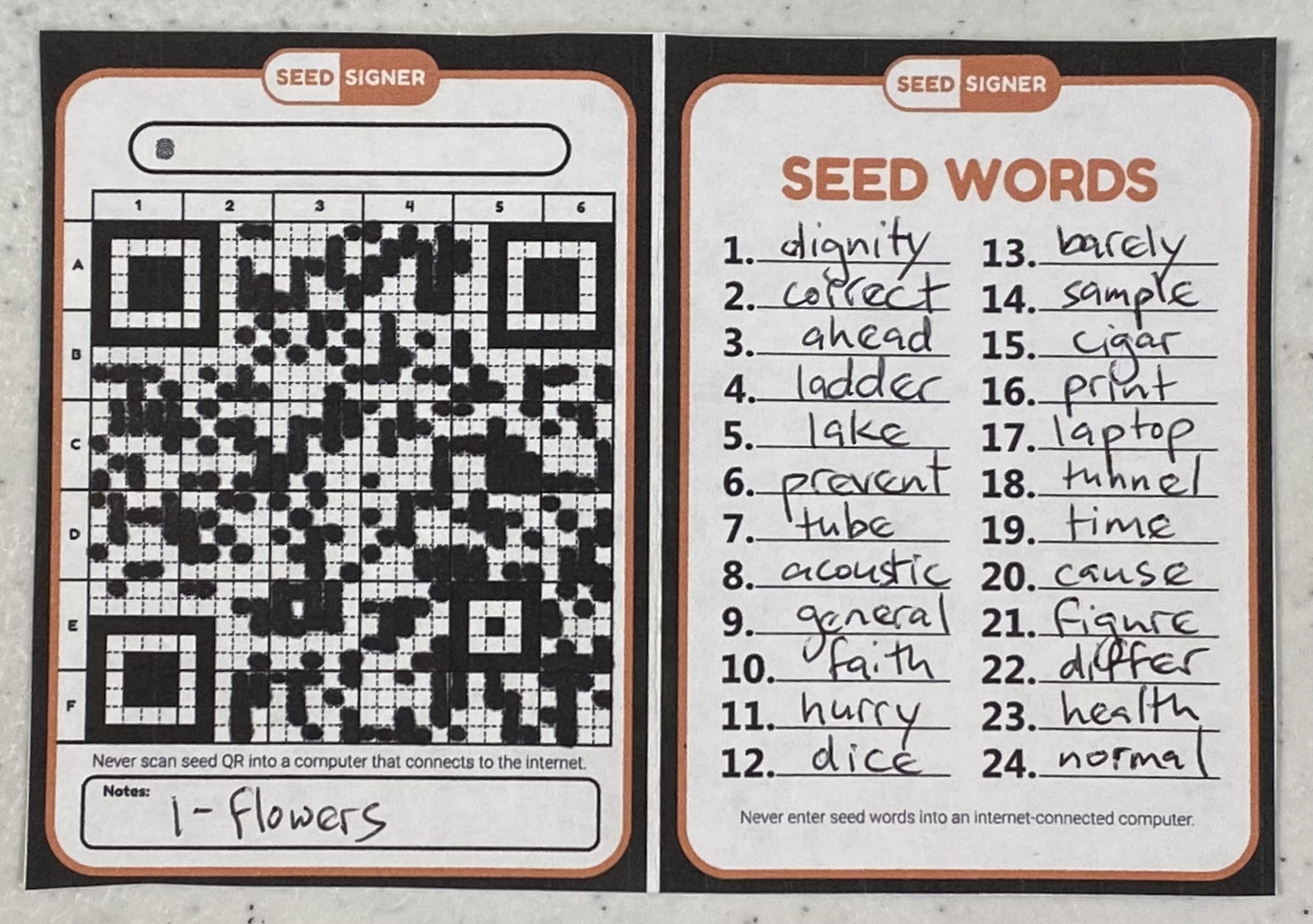 Here is an example of a seed phrase and transcribed SeedQR using one of the forms available in the repo: