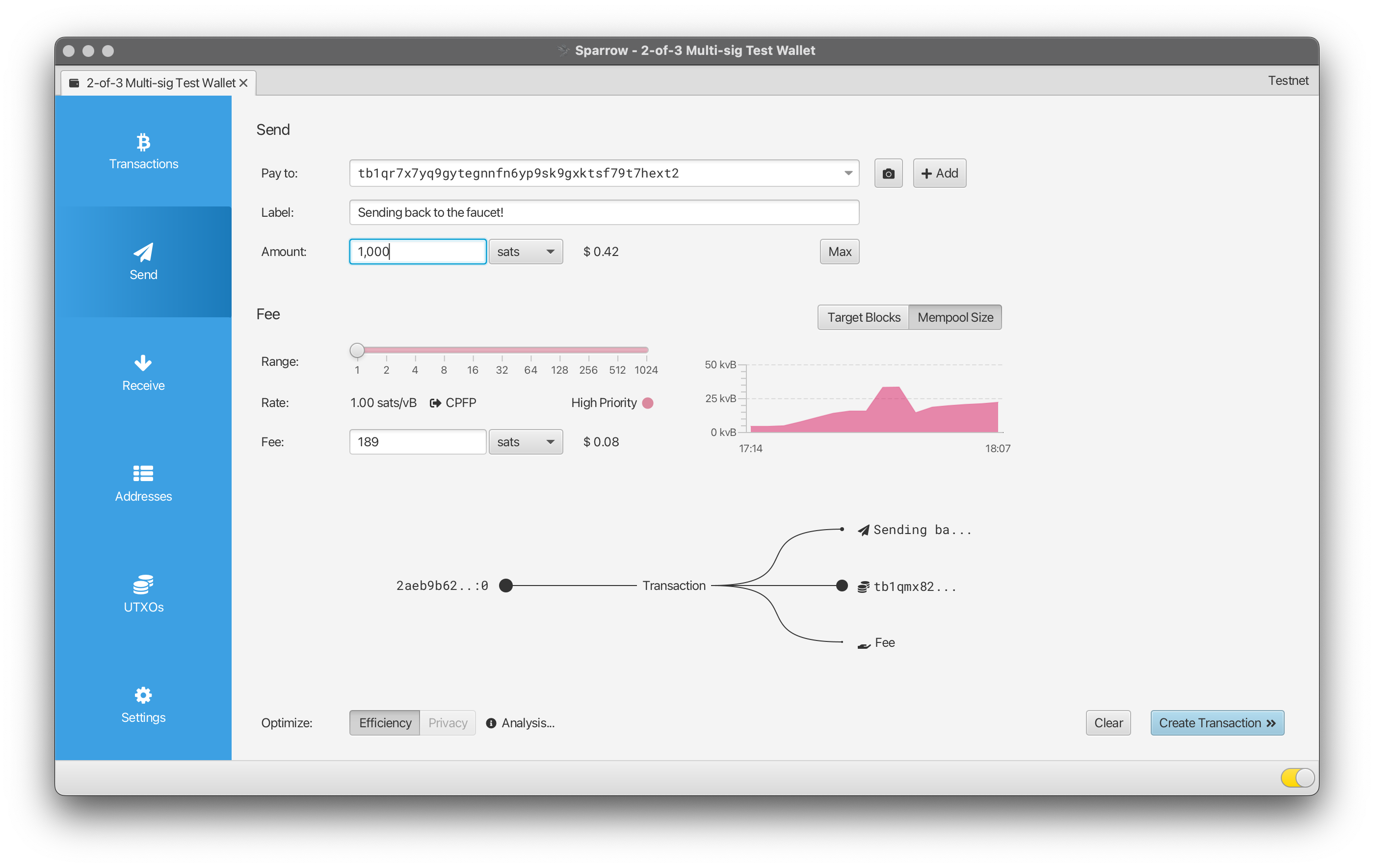 When you are ready to make a spend, visit the “Send” section of the Sparrow interface. Here you can enter the destination address, a label for the transaction, and of course the amount for the spend: