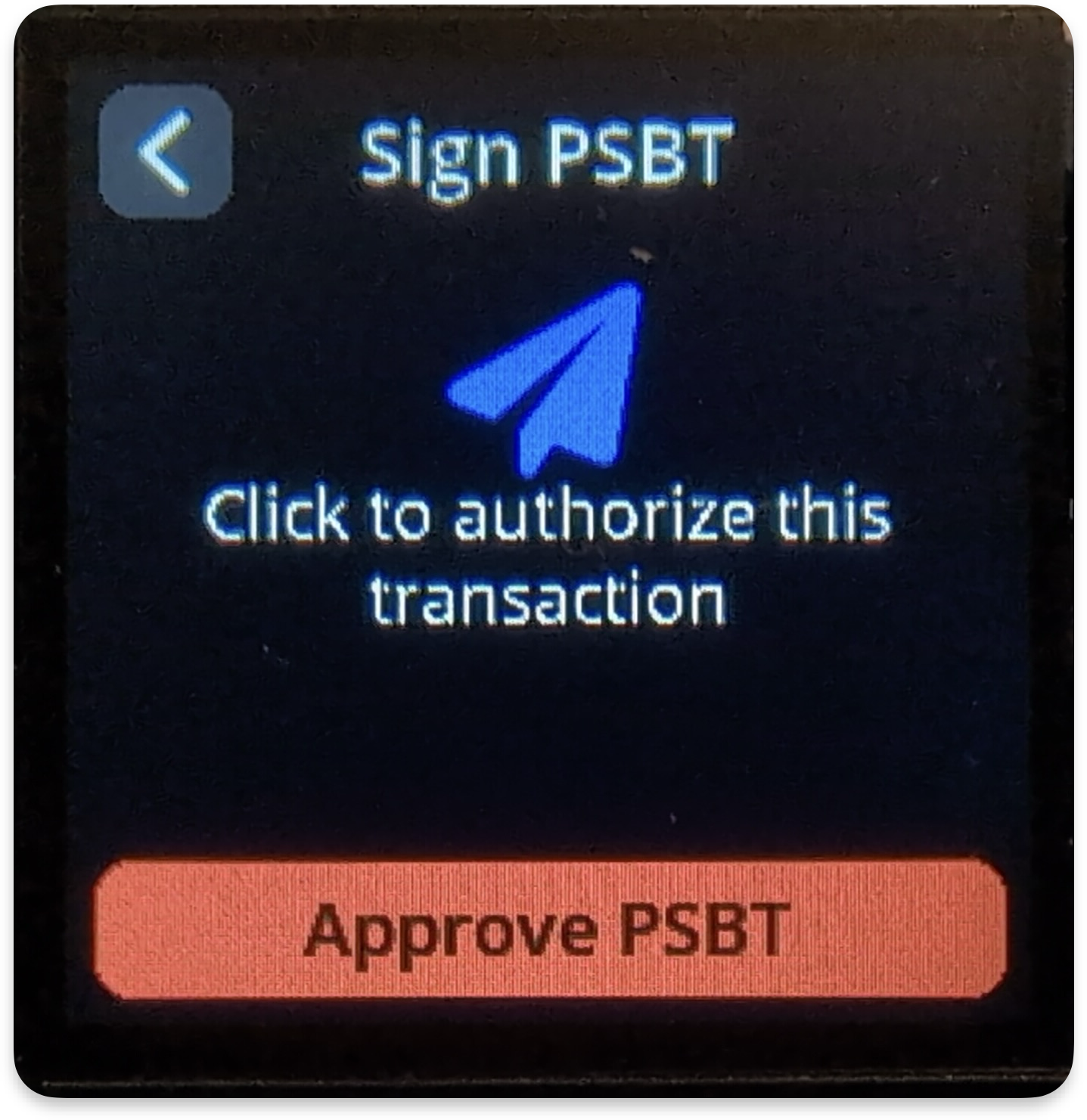 Please note that some of the specific details displayed, such as the change amount and network fee amount, will likely be different. If the details don’t look right, to abort the signing process just click the thumbstick to the left. If all of the details look correct and you would like to authorize the spend, click on: Approve PSBT