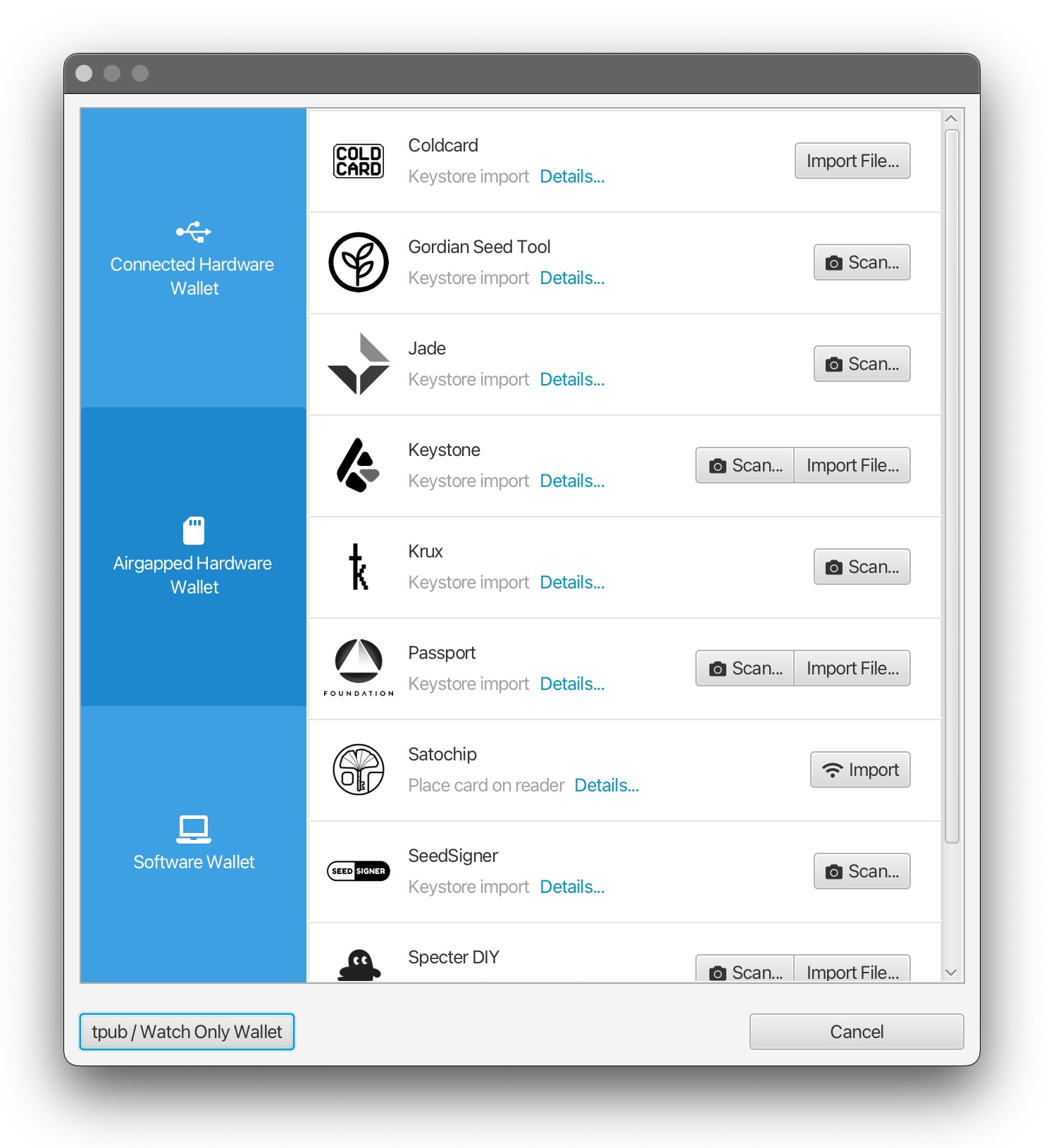 The next step is to add each of the cosigners, which are referred to as the wallet’s “Keystores” in the Sparrow interface. For this wallet, there are three tabs in the Keystores section, each representing one of the cosigners in the multi-signature wallet quorum. Under the “Keystore 1” tab, you can select the “Airgapped Hardware Wallet” button, which will lead to a list of air-gapped hardware devices: