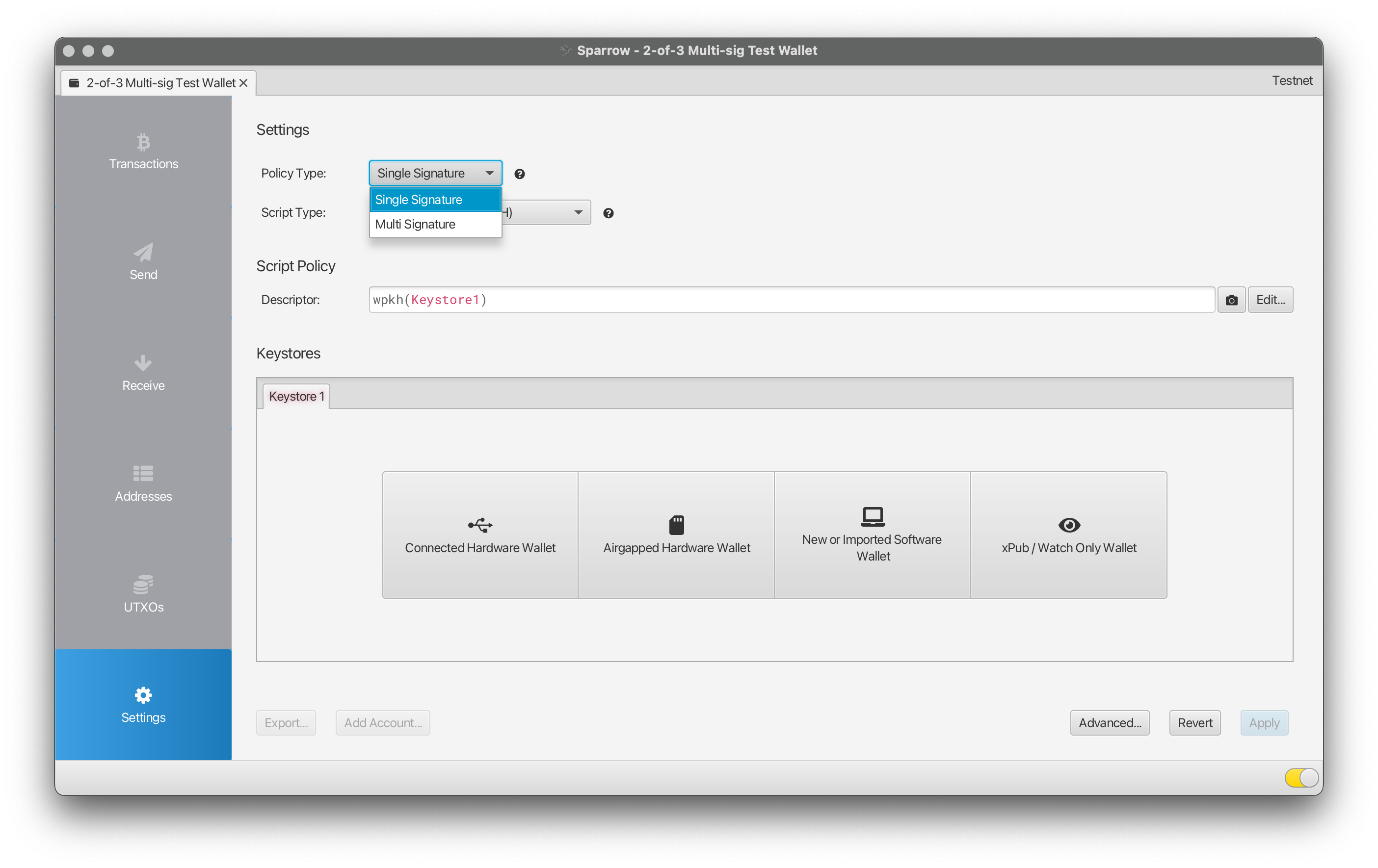 Select “Multi signature” as the wallet Policy Type