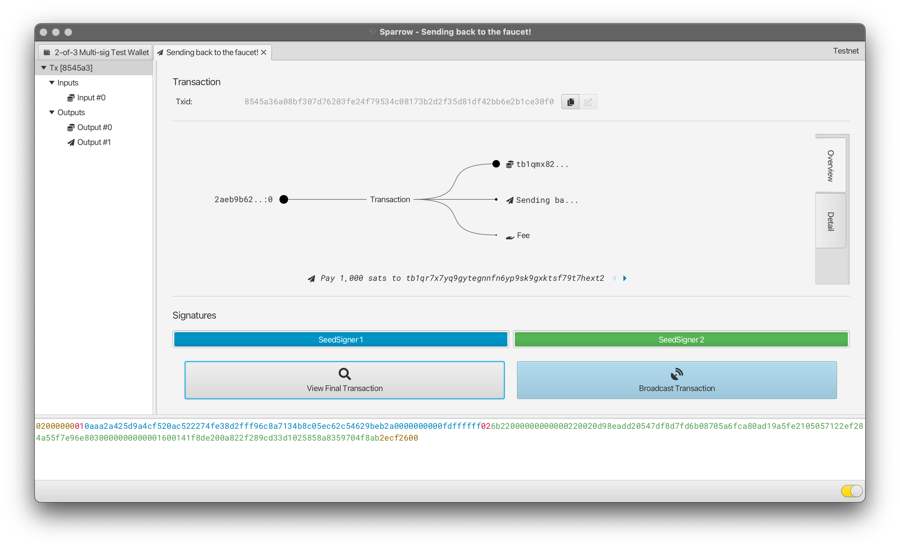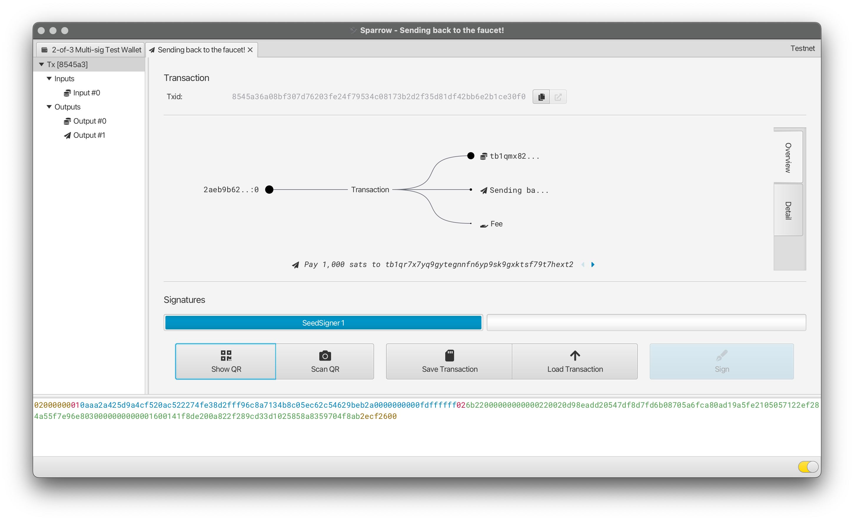 Repeat the preceding steps with your SeedSigner to sign with either “SeedSigner 2” or “SeedSigner 3” and the other “Signatures” section should become shaded in as well: