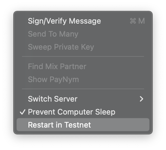 Once that you have the necessary three keys created and documented, it’s time to create your testnet wallet in Sparrow. First, if you didn’t start Sparrow in testnet using the terminal commands above, you can also switch from mainnet to testnet by navigating to Tools —> Restart in Testnet: