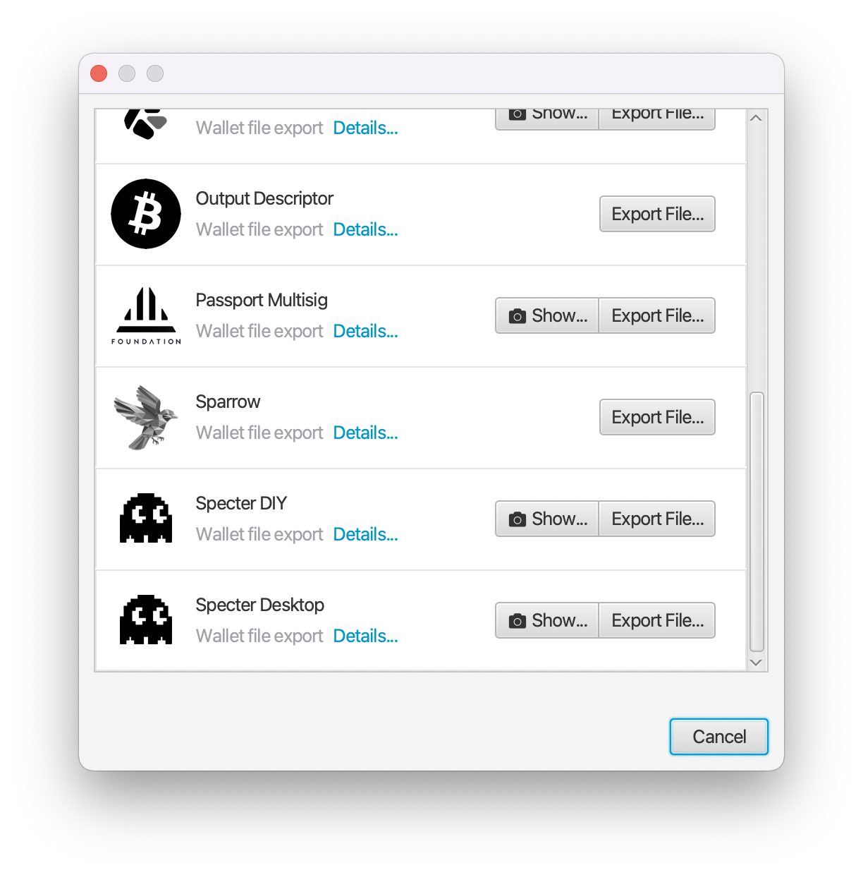 A dialogue box will appear with various wallet descriptor export formats visible, scroll down to the bottom where you will see an entry for “Specter Desktop”: