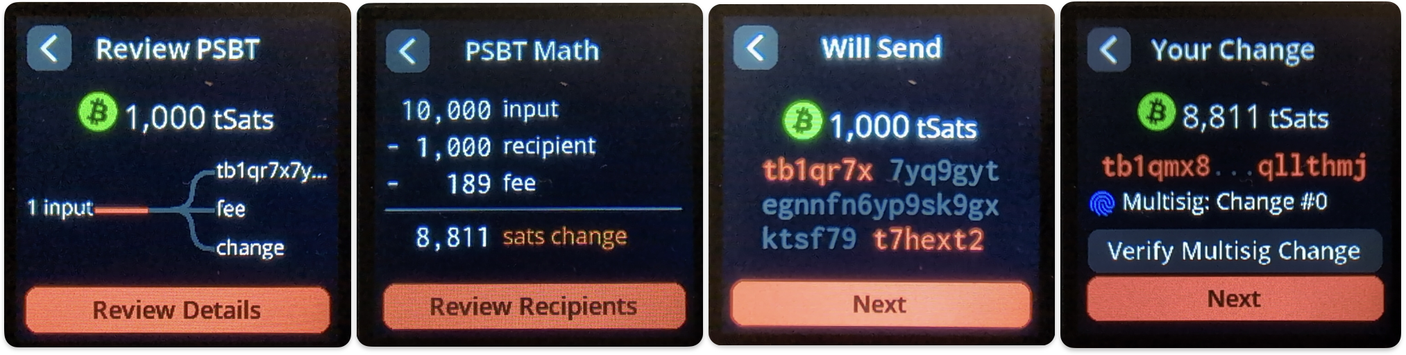 Reliance on a single software/hardware set for multiple keys in a quorum: This is an absolutely reasonable concern – the idea behind it is that if a single device is used for all members of a multi-signature quorum, should should some critical flaw be found in a private key storage/signing mechanism, the security of the entire quorum could be jeopardized. Best practice would be to use multiple different software/hardware profiles to represent the cosigners of a multi-signature wallet, so should a vulnerability be found, a critical majority of the members would not be compromised. In this guide, in exchange for relying on a single device, a user obtains the cost-savings of not having to acquire several different hardware wallets, as well as the advantage of not needing to learn to become fluent in the proper use & maintenance of several different bitcoin storage/signing devices. Given some of SeedSigner’s unique design elements, I believe our model effectively manages the downside risk of this issue, but individual users will have to decide whether they agree with this trade-off. As I often tell people, it’s important not to let the perfect be the enemy of the really good as you consider different trade-offs.