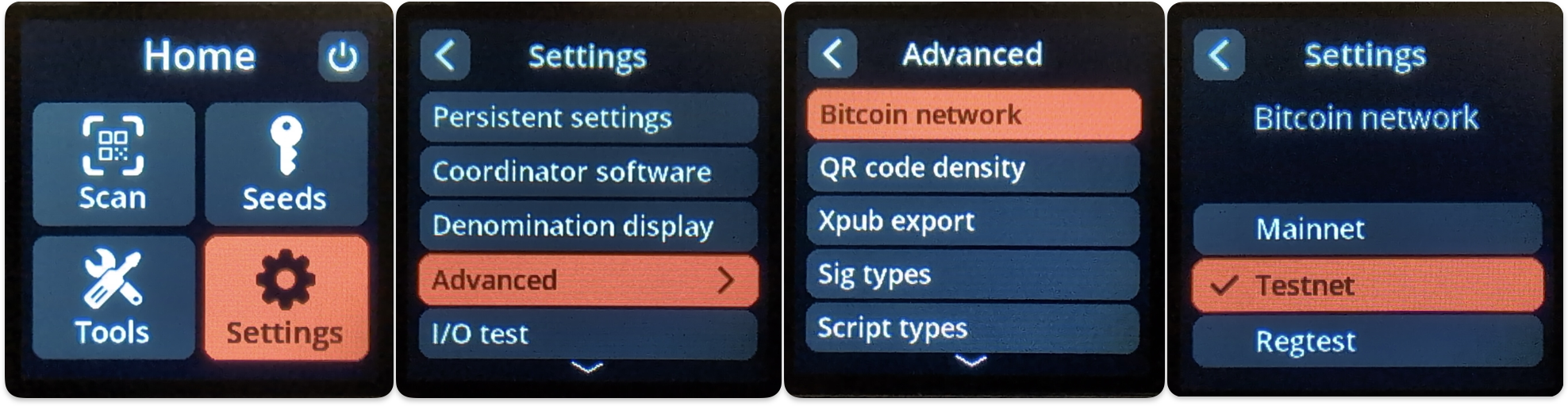 Important Step: Return to your SeedSigner, and ensure that “Network” is set to “Testnet” within the SeedSigner settings. From the home menu, navigate to Settings —> Advanced —> Bitcoin Network —> Testnet