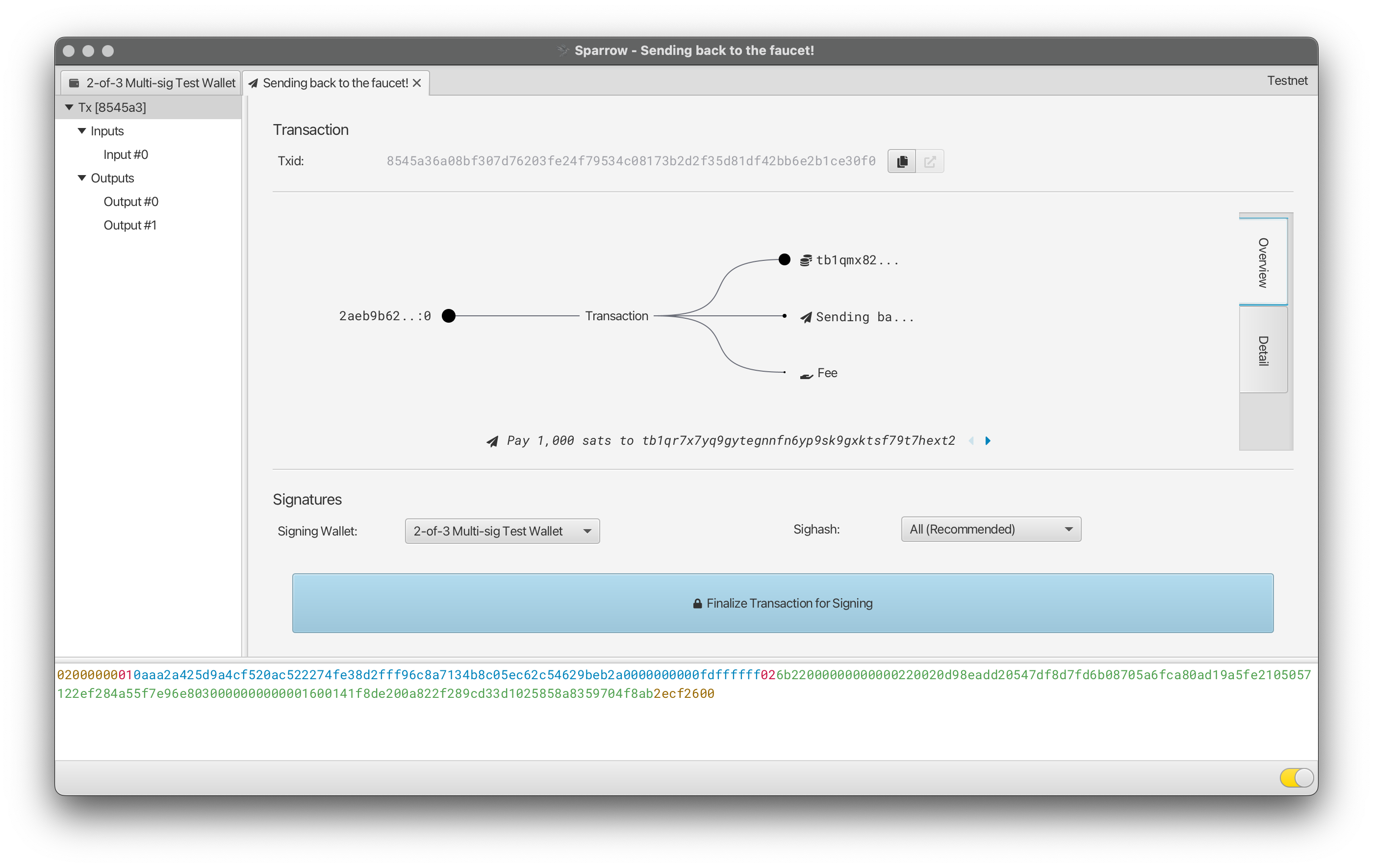 From this screen you can also inspect the transaction’s inputs and outputs. If you’re satisfied with the details, now click the large button at the bottom of the window that reads: “Finalize Transaction for Signing”. Pressing this button makes the different signing options visible: