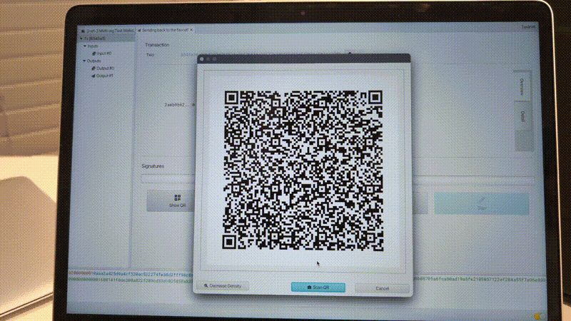 To get those signatures authorizing the transaction back into Sparrow, close the window displaying the animated QR code if you’ve not done so already, and select “Scan QR” from the Sparrow interface. Selecting this option will activate you webcam and allow you to scan the QR codes displayed on your SeedSigner into your computer: