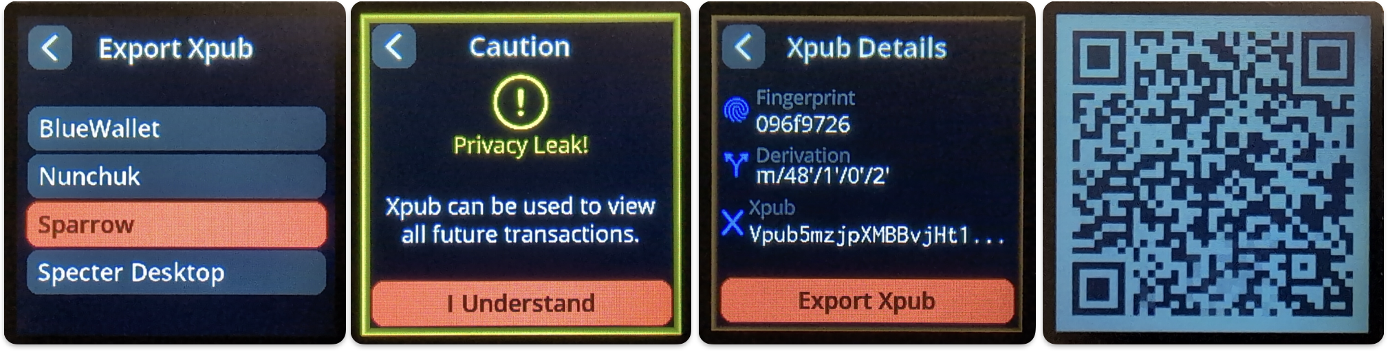 After the Xpub Details review screen, one or more QR codes will be displayed on the screen that represent your seed’s extended public key.
